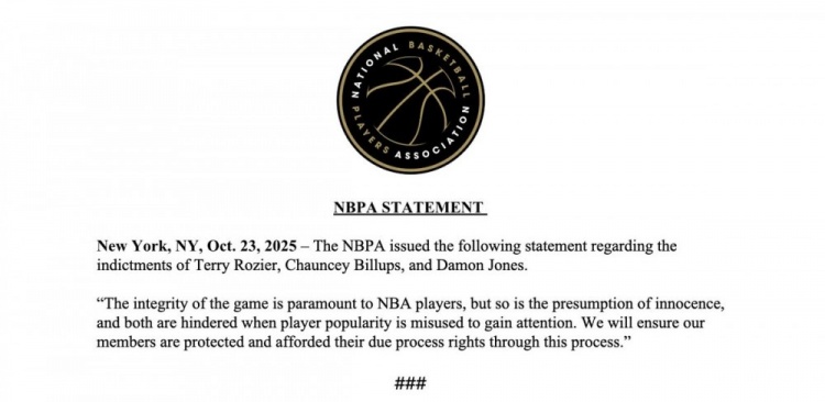 NBA球员工会发表声明如下:“比赛公正性对NBA球员至关重要,但无罪推定原则同样不容践踏。当球员声望被滥用以博取关注时,这两大基石都将遭到破坏。我们将确保会员在此过程中获得应有保护,并享有正当程序权利。”