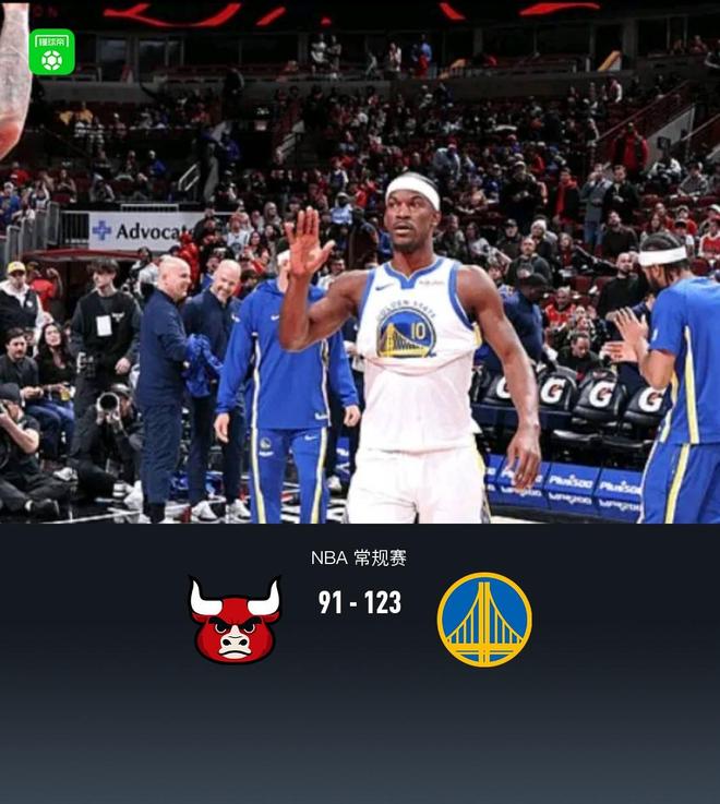 第四节,勇士调整迅速掌控局面,多点开花三分雨不断,半节轰出24-5将分差拉大至30分,随后双方收兵换下主力,最终公牛91-123不敌勇士。