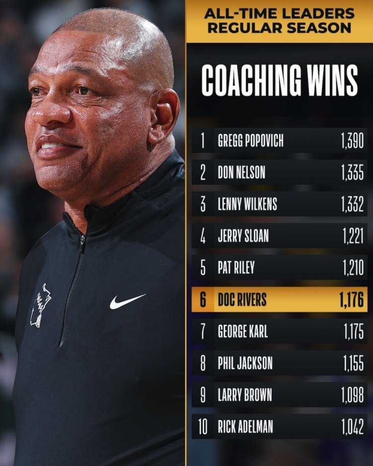 本场比赛过后,雄鹿主帅里弗斯的执教生涯胜场数来到1176场,超越乔治·卡尔,上升至NBA历史第六位,排在他前面的是帕特·莱利。